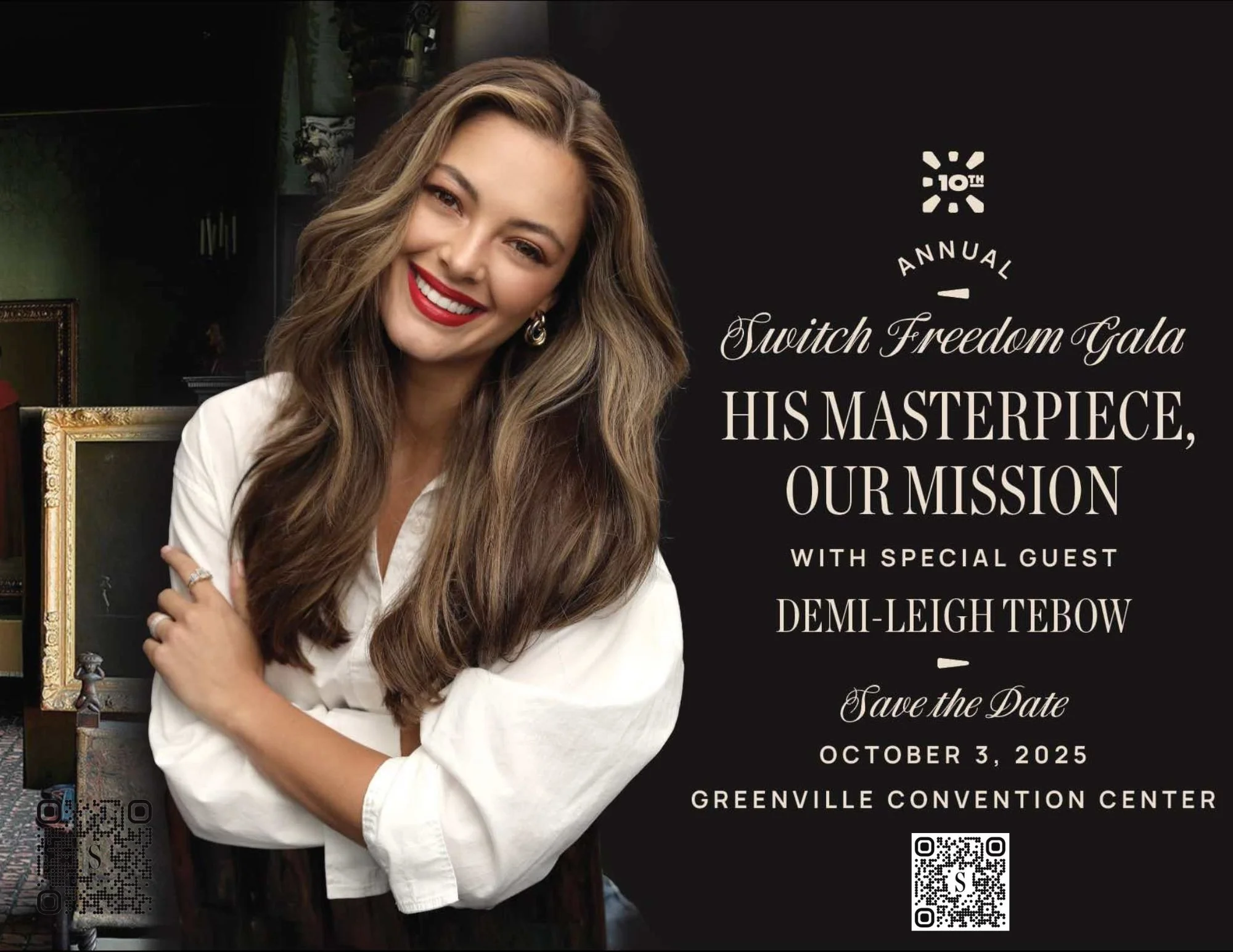 Click here to attend, support or learn more about the Switch Freedom Gala 2025, featuring keynote speaker Demi-Leigh Tebow, Miss Universe 2017 and wife of Tim Tebow.