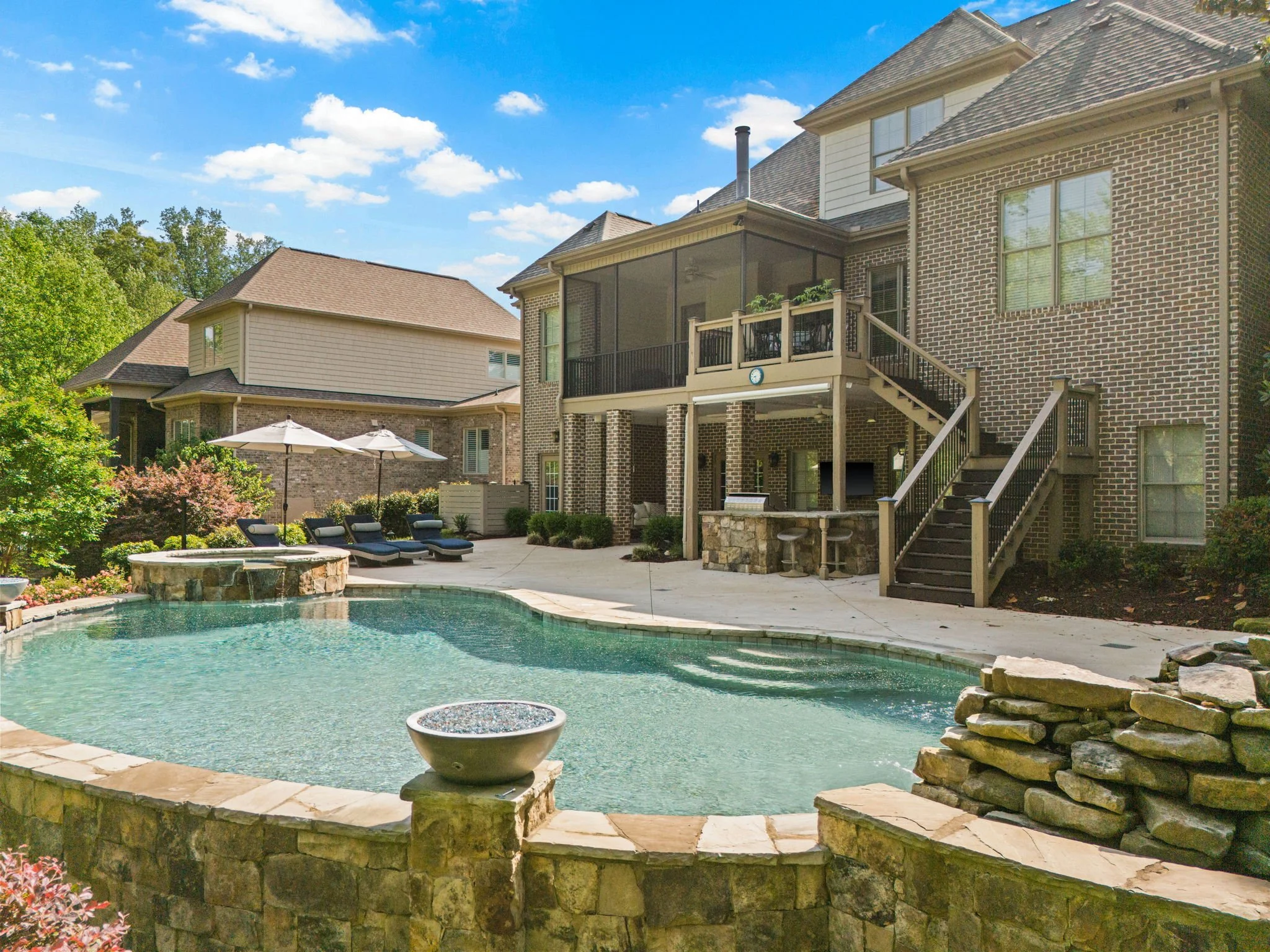 Enjoy a newly added custom saltwater pool with spa and cascading water features—perfectly positioned within a lush, professionally landscaped backyard. The expansive outdoor living area features a full outdoor kitchen, a built-in grill station, and a firepit—ideal for both entertaining and everyday enjoyment.