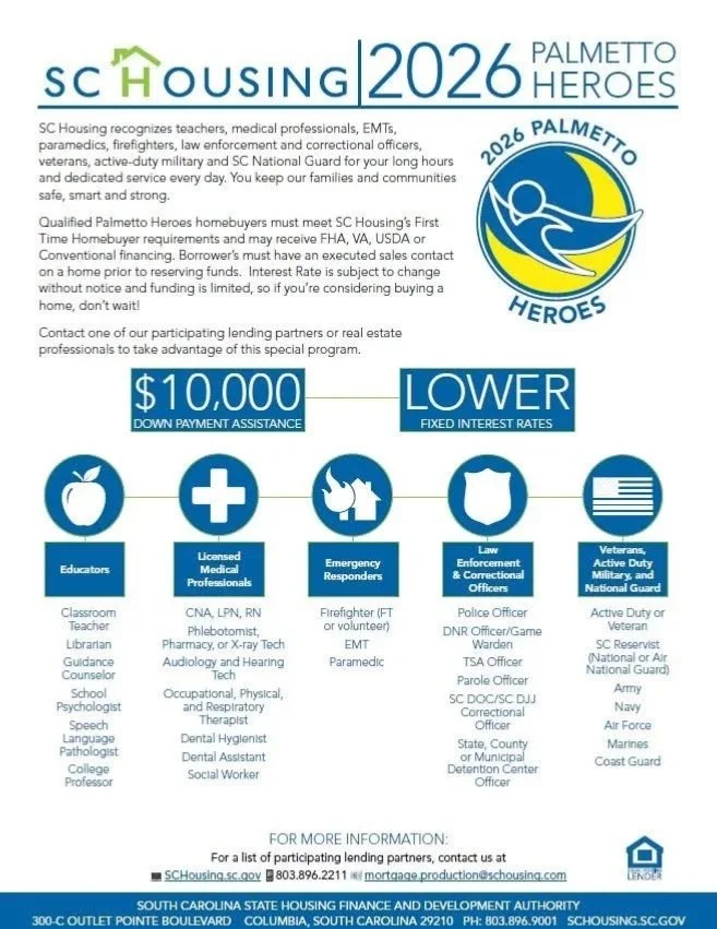 SC Housing has announced the Palmetto Heroes program honoring educators, first-responders, veterans, active-duty military, community service personnel and other frontline workers. Qualified Palmetto Heroes homebuyers may receive a reduced fixed interest rate as low at 4.875% and up to $10,000 in Forgivable Down Payment Assistance (DPA). This is a first-come, first-served program while funds last. Borrowers must have an accepted sales contract on a home prior to reserving funds.